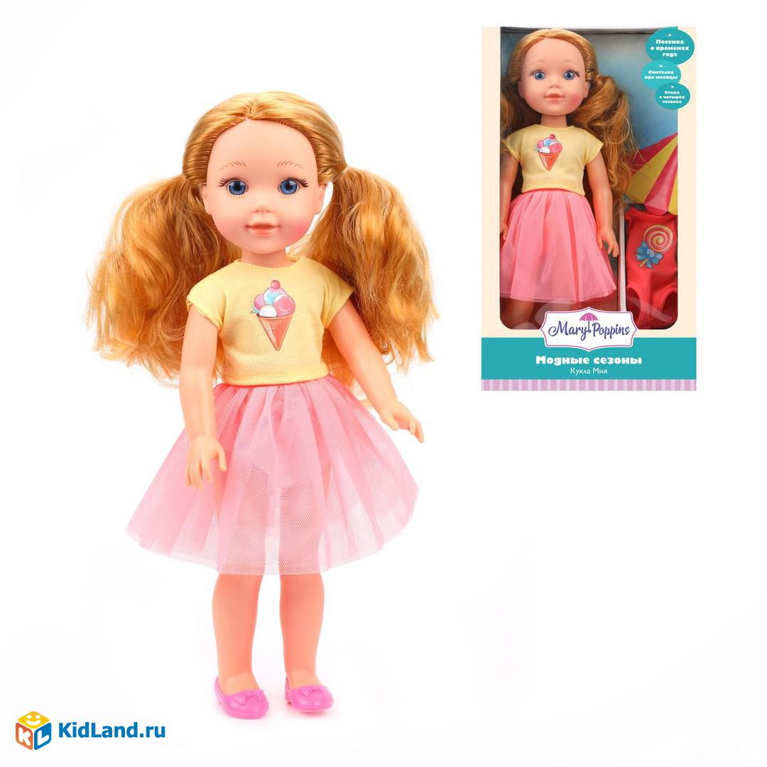 Кукла Мия - настоящая модница! Она всегда одевается по погоде, будь то белоснежная зима, яркая осень, нежная весна или солнечное лето. Куколка умеет подобрать удобный, красивый и стильный наряд для каждого сезона. А ещё Мия рассказывает прекрасные стихи, поёт чудесную песенку про времена года и знает весёлую считалочку, которая поможет запомнить названия всех месяцев.