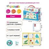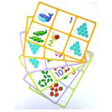 Лото для развития навыков счёта и классификации объектов. Состав игры: игровые поля (14,5 х 21,5 см) – 6 шт., прозрачные карточки с цифрами (6,5 х 6,5 см) – 35 шт. Материалы: картон, пластмасса. Для детей от 3 лет, от 1 до 6 человек. В каждой из 6 ячеек игрового поля изображены различные объекты – животные или абстракции – от 1 до 10 штук. Необходимо правильно подобрать прозрачные карточки с цифрами с картинками на игровом поле.