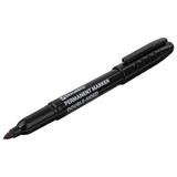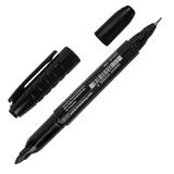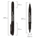 Перманентный двусторонний маркер черного цвета имеет пластиковый корпус круглой формы диаметром 12,4 мм. Особая нестираемая основа перманентного маркера обеспечивает такие качества, как стойкость к воздействию воды, ультрафиолета, низких и высоких температур. Благодаря спиртовой основе чернила быстро сохнут и не размазываются. На противоположных концах корпуса имеет два износостойких наконечника. Толщина линии письма круглого фетрового наконечника - 3 мм, тонкого металлического - 0,8 мм. Изделие не перезаправляется. Плотно закрывается колпачком, что предотвращает высыхание наконечника и чернил. Цвет колпачка соответствует цвету чернил.