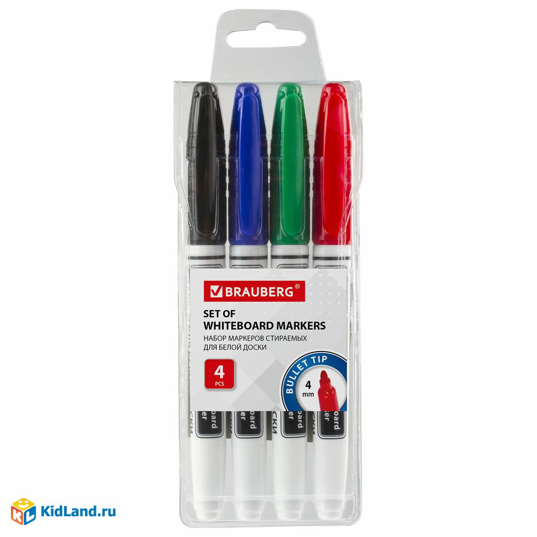 Маркеры стираемые для белой доски НАБОР 4 ЦВЕТА, BRAUBERG, 4 мм, эргономичный корпус, 150850