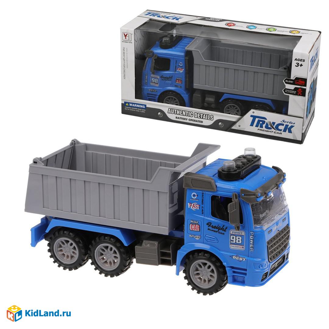 Машина «Грузовик» со звуковыми и световыми эффектами. При поочерёдном нажатии на кнопочки, расположенные на крыше кабины, проблесковые маячки начнут подсвечиваться под реалистичное звуковое сопровождение (3 звука). Машина оснащена инерционным механизмом движения. «Грузовая» платформа откидывается вручную. Световые и звуковые эффекты работают от 3-х батареек типа AG13 (входят в комплект). Перед использованием необходимо удалить картонную заглушку. Цвета представлены в ассортименте. Размер игрушки (ДхШхВ) составляет 28х10х15 см. Изготовлено из пластмассы с элементами металла. Рекомендованный возраст: 3 года +