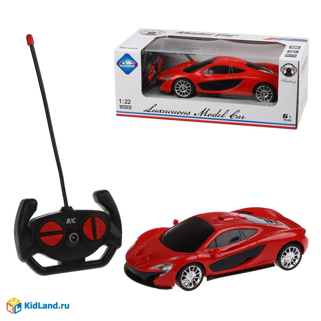 Радиоуправляемая машина-спорткар выполнена в масштабе 1:22. Игрушка двигается во всех направлениях. Команды задаются нажатием соответствующих кнопок на пульте управления. Во время игры включается свет фар.