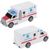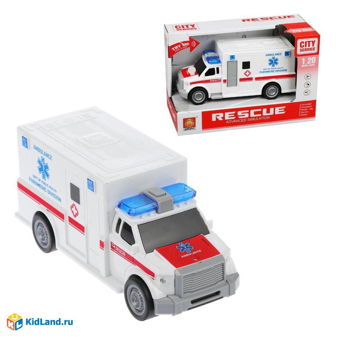 Игрушечная машина с инерционным механизмом движения «Скорая помощь» выполнена в масштабе 1:20. В игрушке предусмотрены светозвуковые эффекты: свет мигалки и звучание сирены, которые активируются нажатием кнопки на крыше кузова. Дверь грузового отсека можно открывать и закрывать вручную.