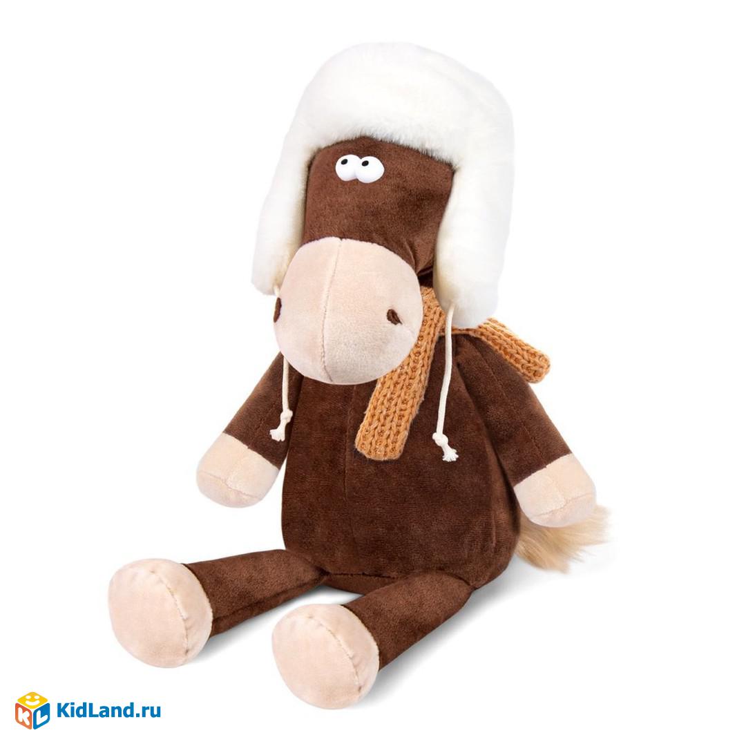 Мягкая игрушка Конь Василий в ушанке и шарфе 22 см