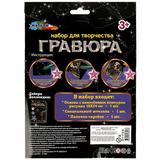 С помощью данного набора юный художник сможет создать эффектную золотистую картину на чёрном фоне. Контур рисунка уже нанесён на основу, остаётся только процарапать изображение специальным штихелем. Готовую поделку можно подарить близким или использовать для украшения интерьера.