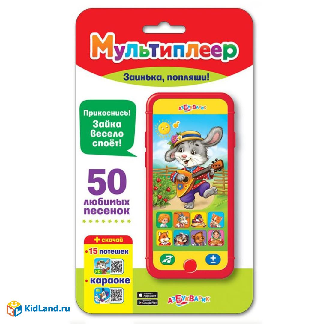 Обучающий мультиплеер «Заинька, попляши!» напоминает своим внешним видом настоящий телефон с сенсорными кнопками, при нажатии на которые ребёнок будет слушать весёлые мелодии. Игрушка проигрывает 50 популярных детских песенок-потешек: "Калинка", "Антошка", "Вышел зайчик погулять", "Два весёлых гуся", "Ладушки", "Валенки", "Баюшки", "Волк-волчок", "Петушок", "Во поле берёза стояла", "Частушки", "Топотушки", "Мороз", "Кошкин дом", "Каравай", "Мишка косолапый" и многие другие. В мультиплеере предусмотрена кнопка регулировки громкости.