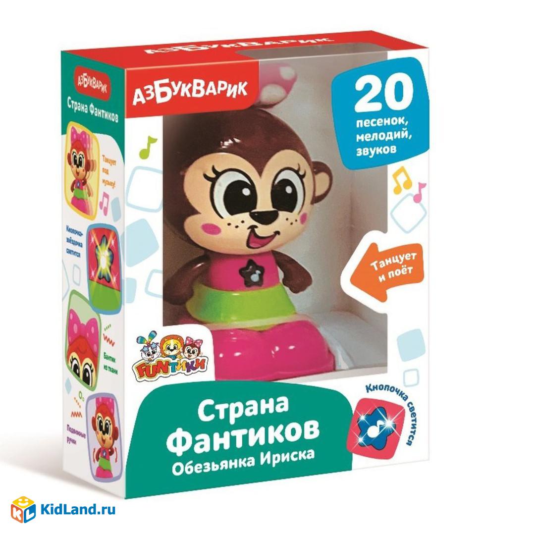 Добро пожаловать в страну Фантиков! Знакомьтесь – это обезьянка Ириска, модная подружка! Ириска очень веселая, любит петь и танцевать, и малыш обязательно захочет с ней подружиться. Нажимайте на кнопочку-звездочку – обезьянка споет 7 песенок и мелодий («Песенка Обезьянки Ириски», «Песенка Фантиков», «Наш весёлый шумный дом», «Мама-мамочка» и др.). Огонек на кнопочке мигает! Если снять фиксатор в нижней части игрушки – Ириска будет танцевать под мелодии. Ребенок сможет танцевать вместе с ней! А еще у обезьянки подвижные ручки и бантик из ткани, который так приятно трогать.