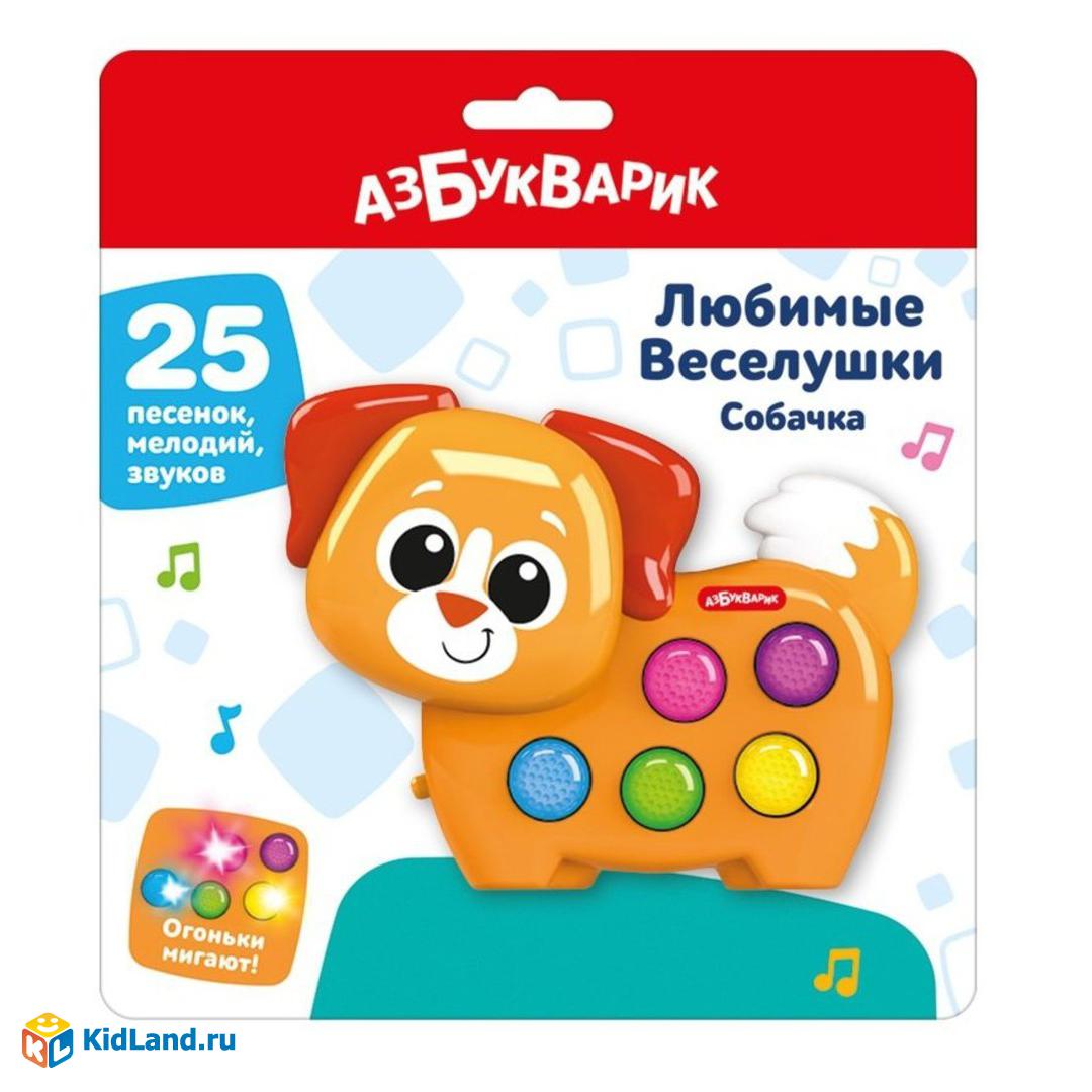 Музыкальная собачка из серии «Любимые Веселушки» мило улыбается и замечательно поет! Нажимая на разноцветные кнопочки, малыш послушает веселые песенки и мелодии («Собачка-непоседа», «Антошка», «Весёлые путешественники», «Каравай», «Собачий вальс» и др.), а также множество забавных звуков и голосов зверят. Всего в игрушке 25 песенок, мелодий, звуков. Во время звучания песенок на кнопочках мигают огоньки!