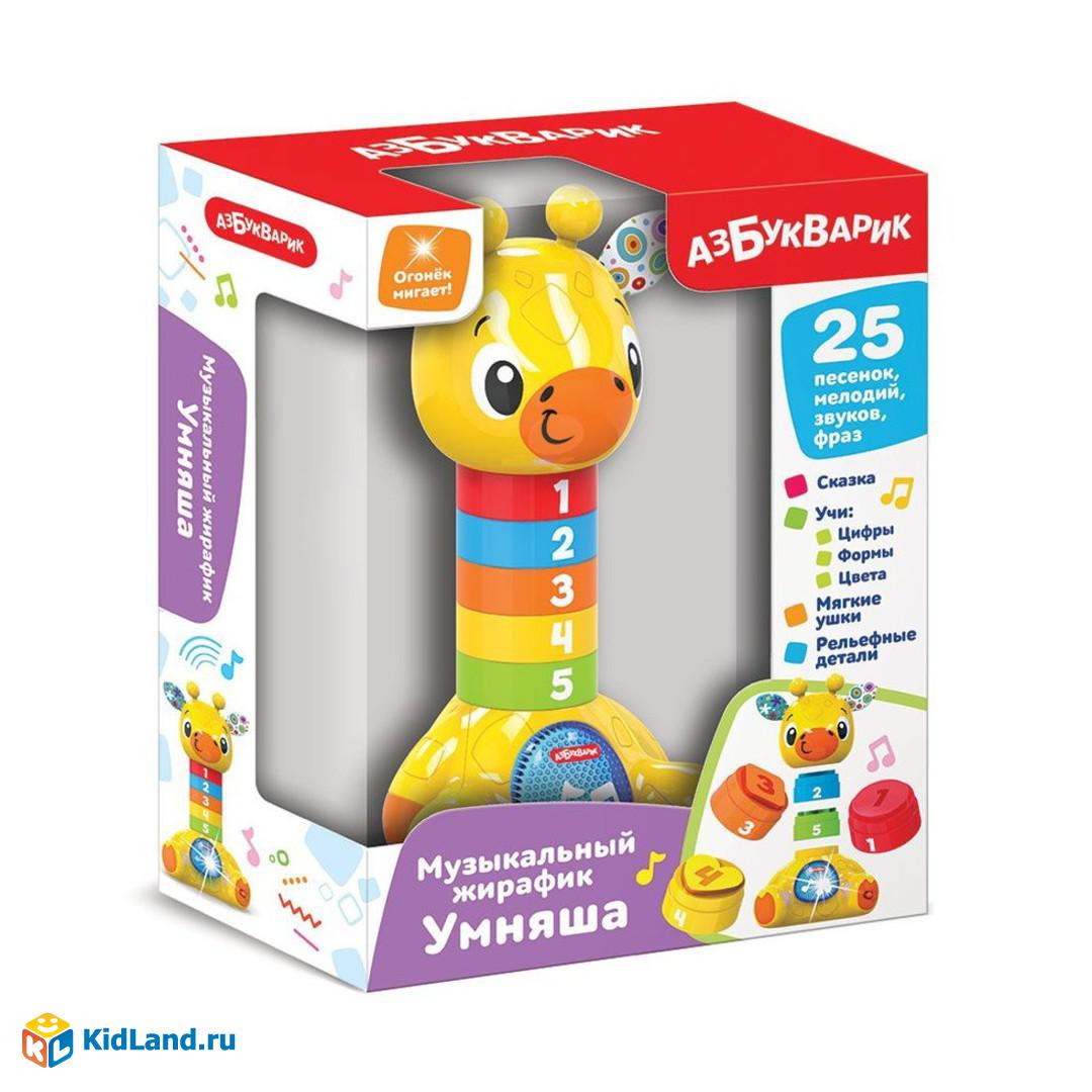 Необычная развивающая игрушка для малышей! Ребенок может сам собрать своего музыкального жирафика. Длинная шея жирафика состоит из рельефных деталей разного цвета и размера. Их можно каждый раз соединять по-разному, при этом изучать цифры, формы и цвета. Нажимая на кнопочку с огоньком, ребенок послушает интересную сказку «Жирафик в цирке», 5 песенок («Как много игрушек на свете!», «Как хорошо уметь считать!», «Цвета радуги», «Чунга-чанга», «Веселые противоположности»), забавные мелодии и звуки. Огоньки на кнопочках мигают под музыку и дарят отличное настроение. А еще у жирафика есть мягкие ушки, которые шуршат.