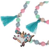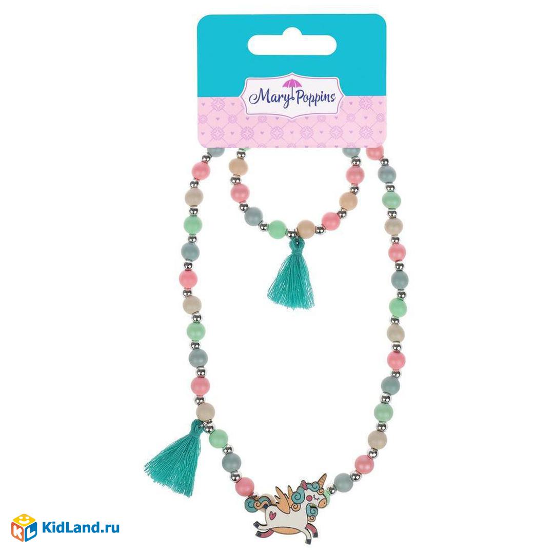 В комплекте -- бусы с подвеской-единорогом и браслет. Украшения сделаны из аккуратных круглых бусин нежно-розового, жёлтого, серебристого, небесно-голубого и светло-зелёного цвета. Эти стильные аксессуары будут прекрасно сочетаться с большинством нарядов юной леди.