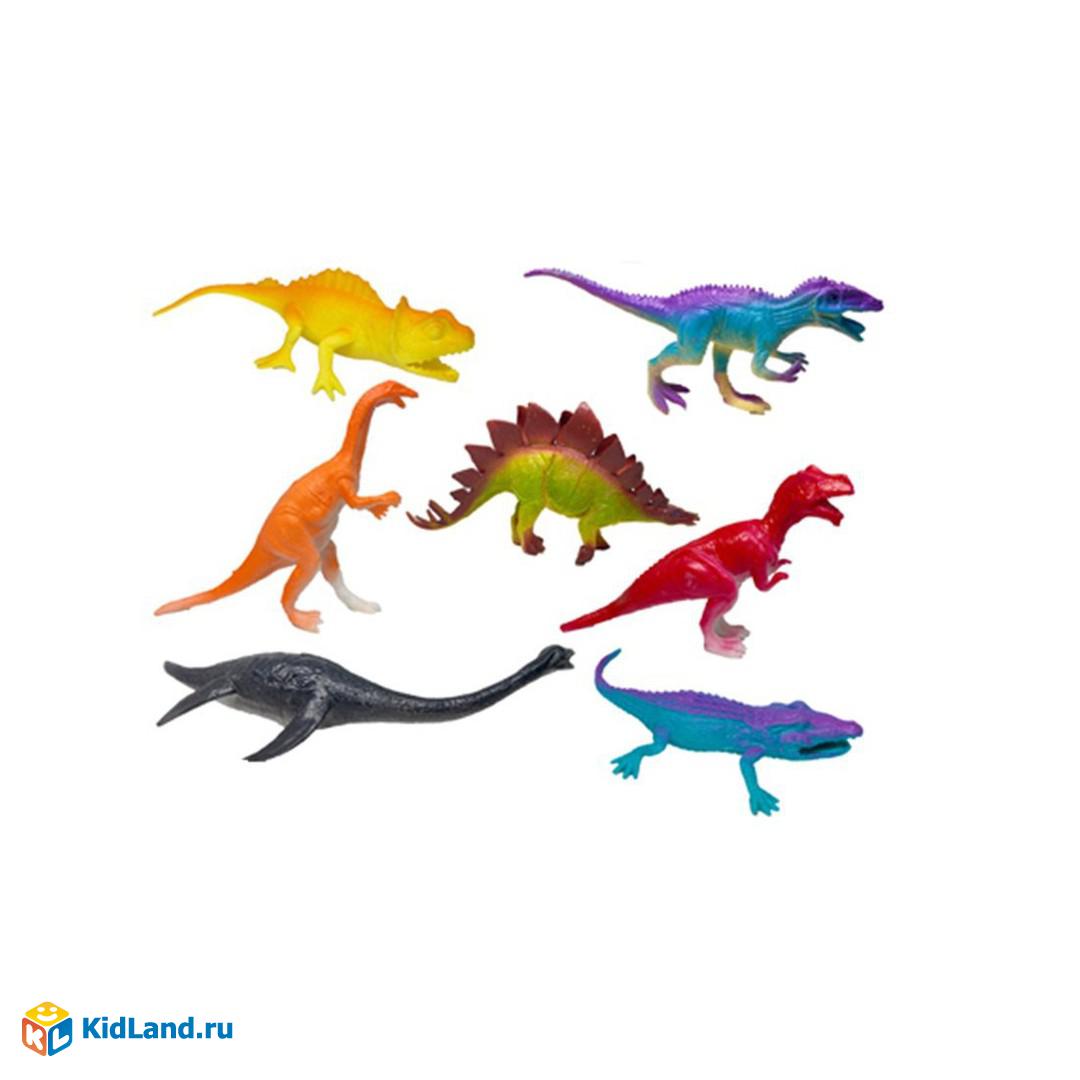 Набор включает в себя 7 фигурок динозавров, разных по цвету, форме и размеру. Высота фигурок составляет 2,5-9 см, длина: 9-16,5 см.