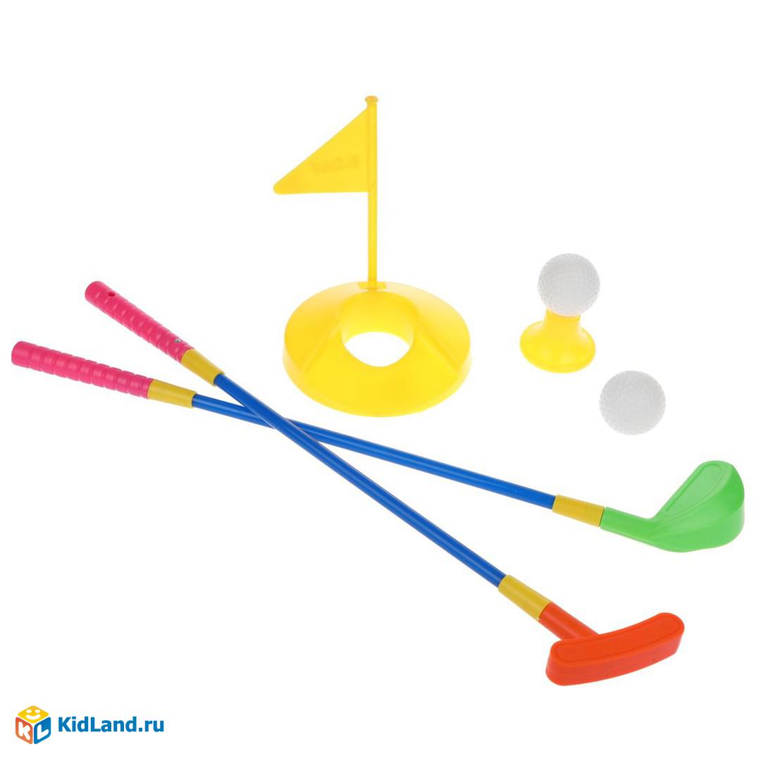 Этот яркий набор предназначен для игры в гольф и включает 7 предметов: 2 клюшки длиной 42 см, 2 мячика диаметром 4 см, 1 флажок, 1 подставку для мяча и 1 лунку.