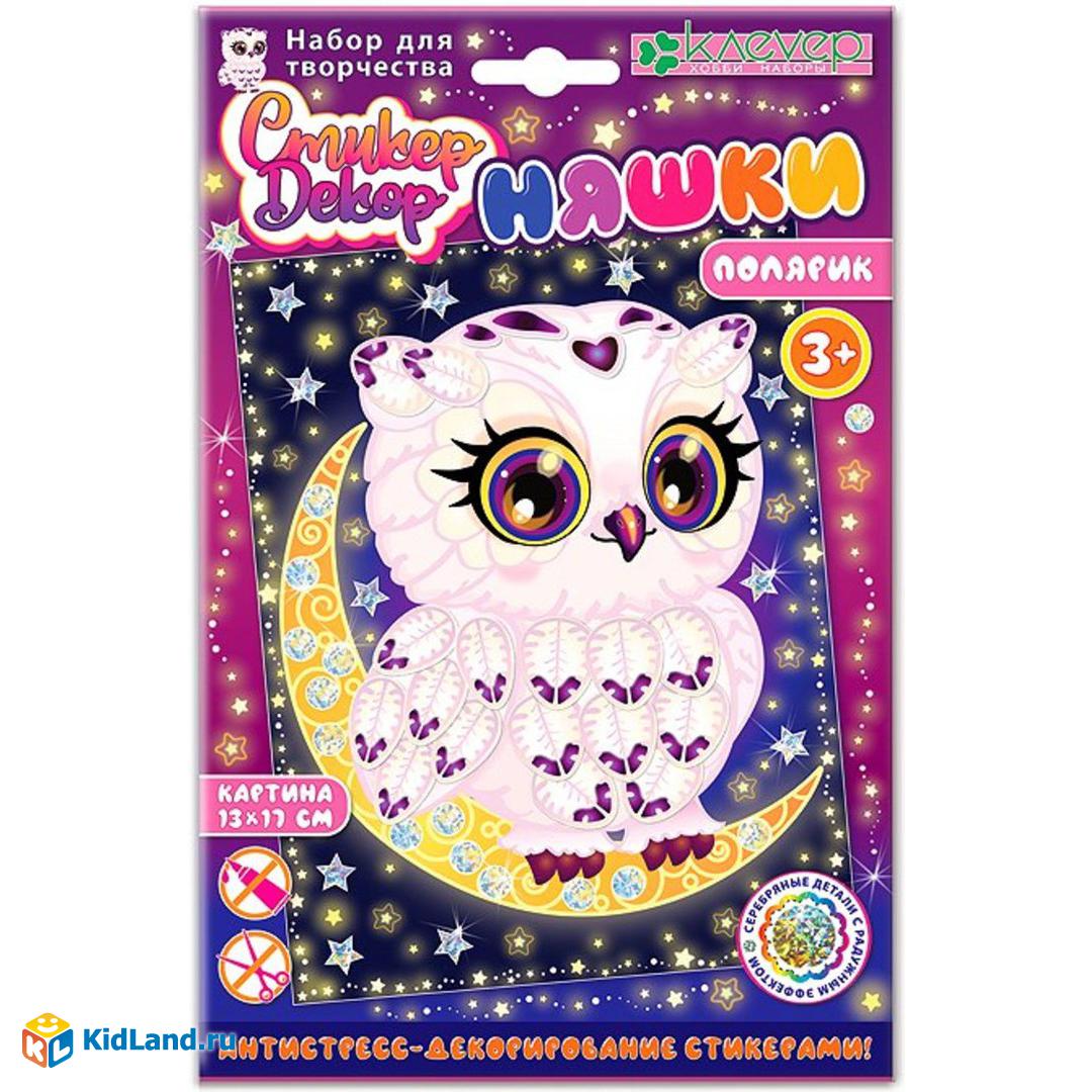 Волшебство техники «антистресс-декорирование стикерами» вовлекает в процесс творчества даже самых маленьких детей! Детям от 3-х лет будет несложно создать картину с белым совёнком-Поляриком: нужно наклеить стикеры-пёрышки и стикеры-пятнышки на изображение персонажа на фоне, наклеить голографические круги на изображение луны на фоне, заполнить пространство вокруг Полярика и луны фигурными голографическими стикерами--звёздами, - и замечательная картина с ярким персонажем на фоне звёздного неба готова! Подарите ребёнку радость самовыражения и творчества!