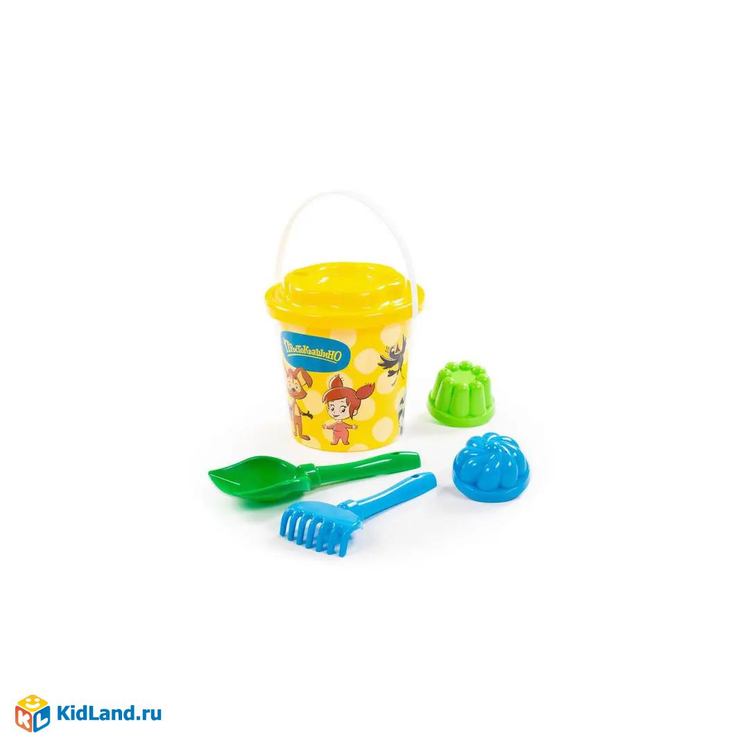 Набор для песочницы ПОЛЕСЬЕ Простоквашино №6 ведро с наклейкой, ситечко Солнышко, лопатка №5, грабельки №5, 2 формочки