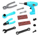 В комплекте - 14 предметов, среди которых юных подмастерье найдёт дрель с механическим запуском, 2 насадки, 3 гаечных ключа, плоскогубцы, пассатижи, 2 гайки, 2 болта и 2 прямоугольных элемента, имитирующих древесину.