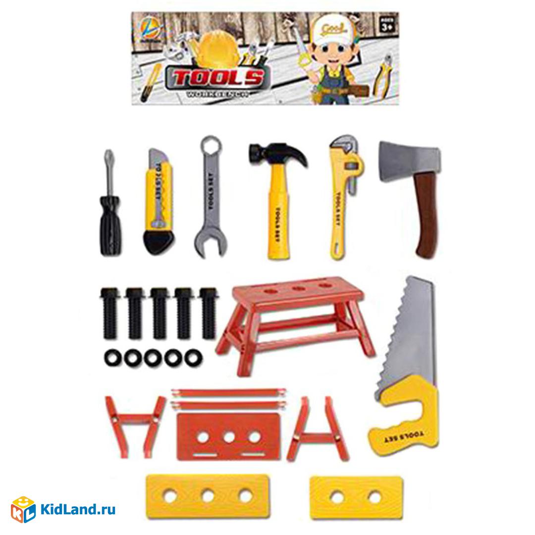 В комплекте 24 предмета: отвертка, строительный ножик, газовый ключ, гаечный ключ, 5 болтов, 5 гаек, молоточек, пила, топор, 2 прямоугольных элемента, имитирующих древесину, 5 элементов, из которых можно собрать лавочку.
