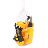 В комплект входит 7 предметов: струбцина, молоточек, разводной ключ, плоскогубцы, дрель, болт и гайка.
