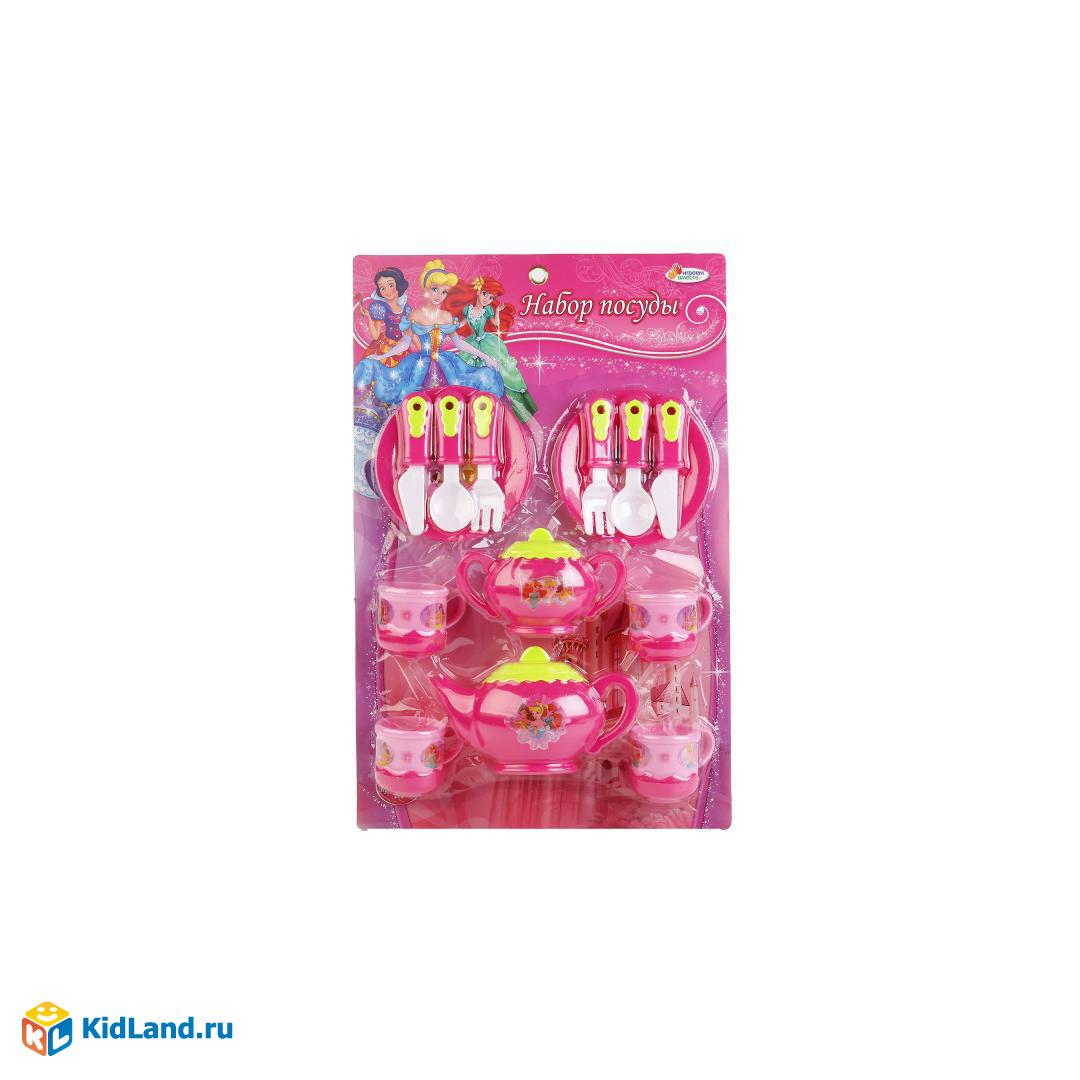 НАБОР ПОСУДЫ "ИГРАЕМ ВМЕСТЕ" НА БЛИСТЕРЕ (РУСС. УП.) в кор.2*24шт С миниатюрным набором посуды ребёнок без труда устроит чаепитие своим куклам и игрушкам. В набор входит заварочный чайник, сахарница, 4 чашки и 2 блюдца, 2 ложки, 2 вилки и 2 ножа. Предметы выполнены в розовом-салатовом цвете, на них нанесены изображения персонажей диснеевских мультфильмов: Золушка, Белоснежка и Русалочка. Аксессуары из набора окрашены стойкими безопасными красителями, которые долгое время сохраняют свой первоначальный цвет. В процессе игры развивается мелкая моторика, воображение и образное мышление. Рекомендовано детям от 3 лет. Товар лицензирован.