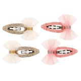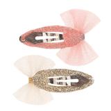 В комплекте – 2 сверкающих заколки клик-клак, декорированные бантами. Цветовые варианты представлены в ассортименте.