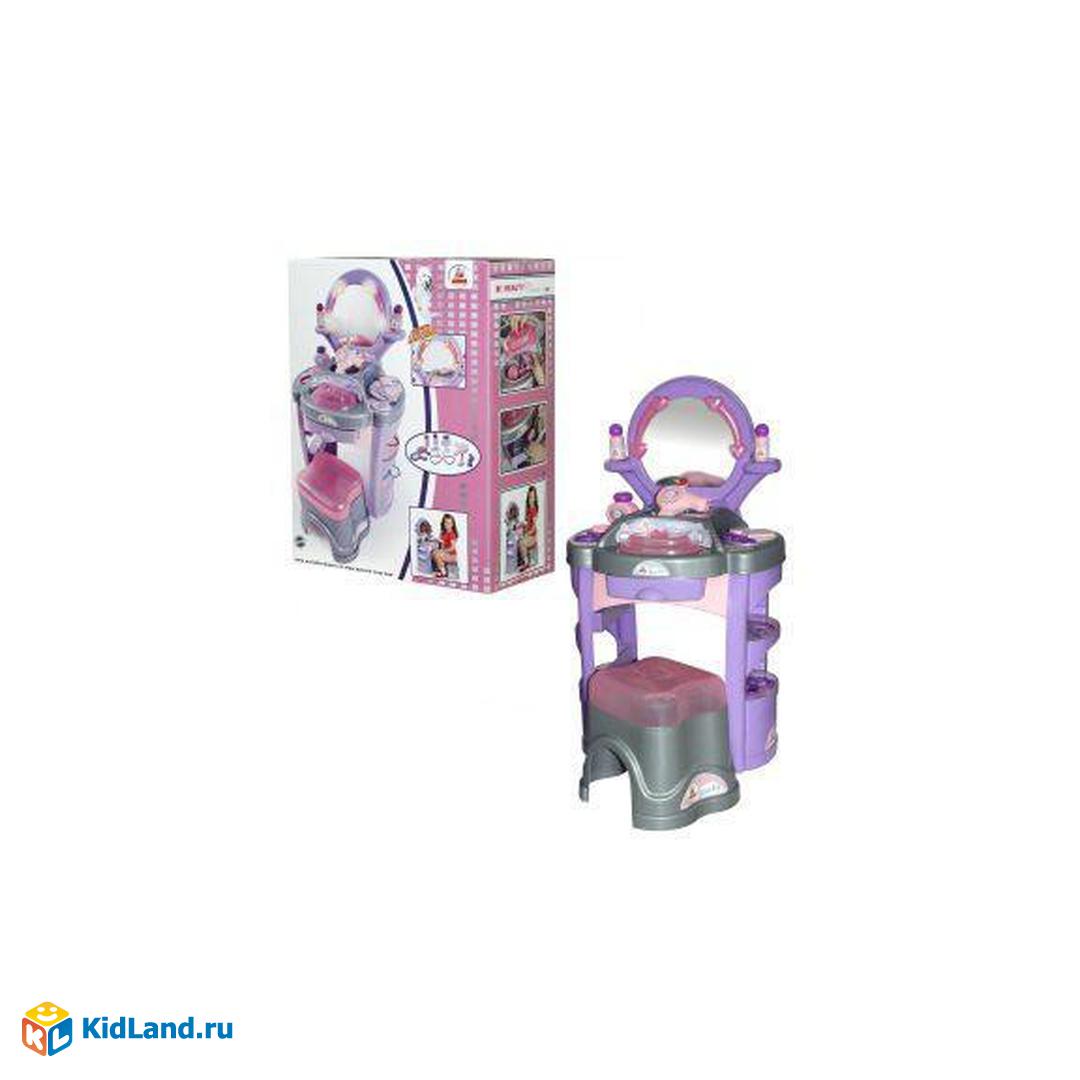 Замечательный игровой набор для девочек состоит из трюмо с выдвижным ящиком и зеркалом и табурета. Включается подсветка зеркала. В наборе есть все необходимое для увлекательной игры в салон красоты!Игрушка работает от 3 батареек «АА» (в комплекте).