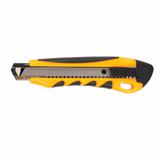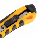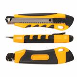 Нож имеет 3 лезвия шириной 18 мм, что обеспечивает быструю резку. Благодаря удобной ручке с резиновыми вставками обеспечивается комфорт и безопасность. Предусмотрен автофиксатор, при помощи системы блокировки лезвия предотвращающий его сдвиг в процессе работы. В пластиковом корпусе предусмотрено отверстие для подвеса, что позволяет удобно хранить принадлежность. Нож отличается эргономичностью и практичностью, подходит для офисного и домашнего использования. Поставляется в нескольких вариантах цвета (без возможности выбора).