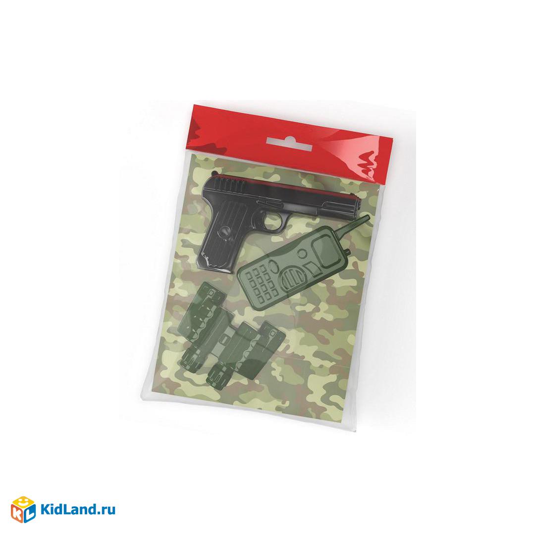 Оружие пластиковое. Пистолет. Рация. Бинокль. (выдувка). Состав: пистолет чёрный – 1 шт. (15,5 х 10,5 см), рация зелёная – 1 шт. (14,5 х 4,5 см), бинокль зелёный – 1 шт. (6,5 х 7,8 см). Материал: пластмасса. Для детей от 3 лет. Игра с пластиковым пистолетом, рацией и биноклем поможет развить подвижность, мелкую моторику рук, меткость, внимательность, фантазию и станет незаменимым помощником в играх, посвящённых военно-исторической тематике.