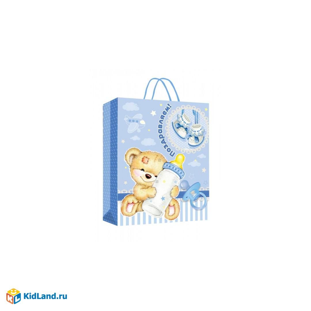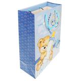 Этот праздничный пакет в голубых тонах с изображением плюшевого мишки, пустышки и пинеточек отлично подойдёт для презентации подарка новорождённому малышу. Размер ML позволяет использовать пакет для презента компактного формата.