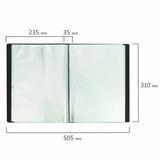 Для маркировки содержимого на корешок наклеена этикетка. Папка изготовлена из качественного пластика толщиной 0,8 мм с антибликовой фактурой, а ширина корешка составляет 35 мм. Содержит 100 вкладышей, позволяющих хранить документы формата А4 и обеспечивающих их надежную защиту от попадания влаги, пыли и прочих повреждений.