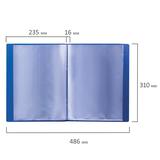 На корешке имеется карман для маркировки содержимого. Папка изготовлена из качественного пластика толщиной 0,6 мм с антибликовой фактурой, а ширина корешка составляет 16 мм. Содержит 20 вкладышей, позволяющих хранить документы формата А4 и обеспечивающих их надежную защиту от попадания влаги, пыли и прочих повреждений. Поставляется в индивидуальной упаковке.