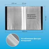 На корешке имеется карман для маркировки содержимого. Папка изготовлена из качественного пластика толщиной 0,7 мм с антибликовой фактурой, а ширина корешка составляет 25 мм. Содержит 40 вкладышей, позволяющих хранить документы формата А4 и обеспечивающих их надежную защиту от попадания влаги, пыли и прочих повреждений. Поставляется в индивидуальной упаковке.