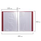 На корешке имеется карман для маркировки содержимого. Папка изготовлена из качественного пластика толщиной 0,7 мм с антибликовой фактурой, а ширина корешка составляет 25 мм. Содержит 40 вкладышей, позволяющих хранить документы формата А4 и обеспечивающих их надежную защиту от попадания влаги, пыли и прочих повреждений. Поставляется в индивидуальной упаковке.