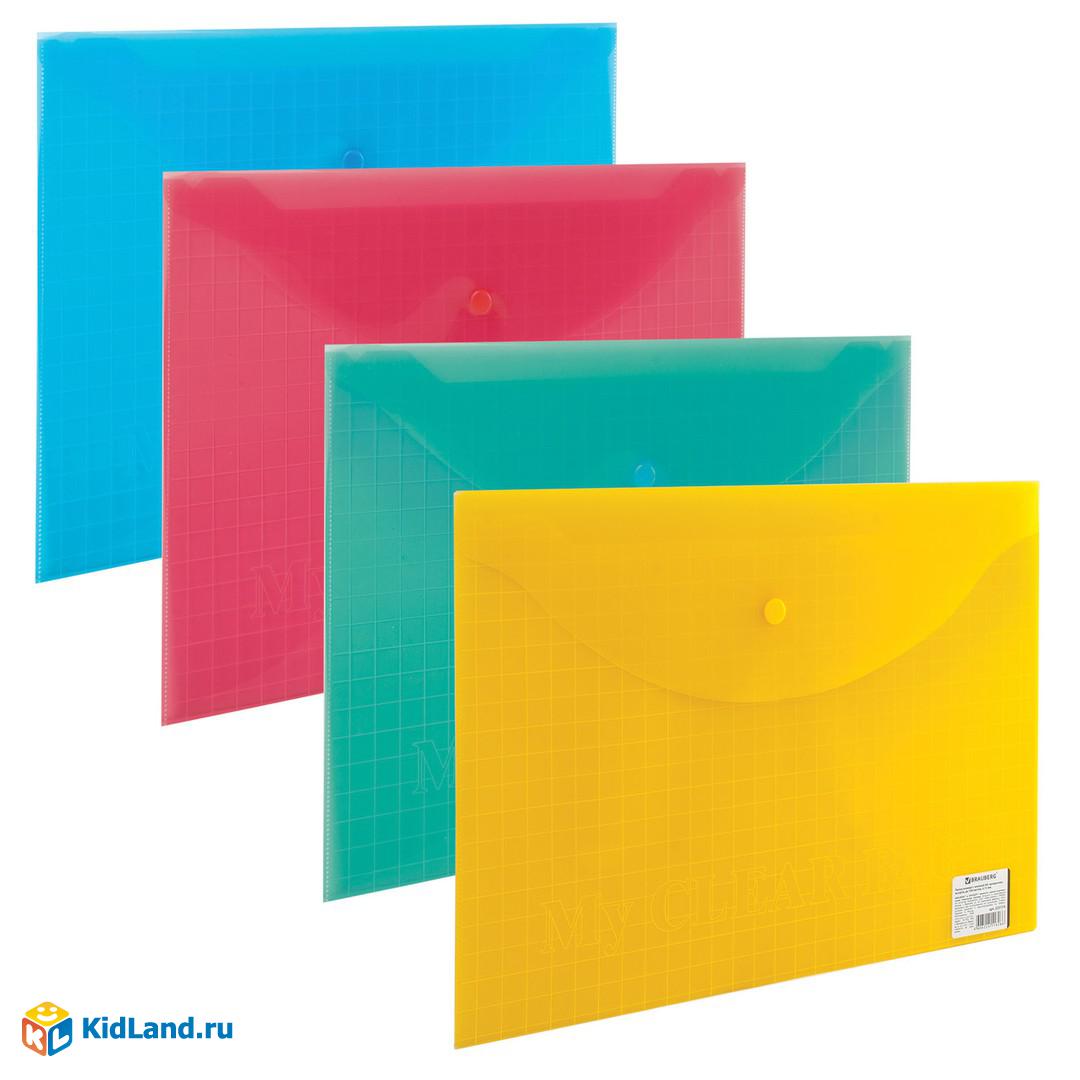Папка-конверт с кнопкой BRAUBERG "My CLEAR BAG", А4, до 100 л, прозрачная, ассорти, 0,15 мм, 225174