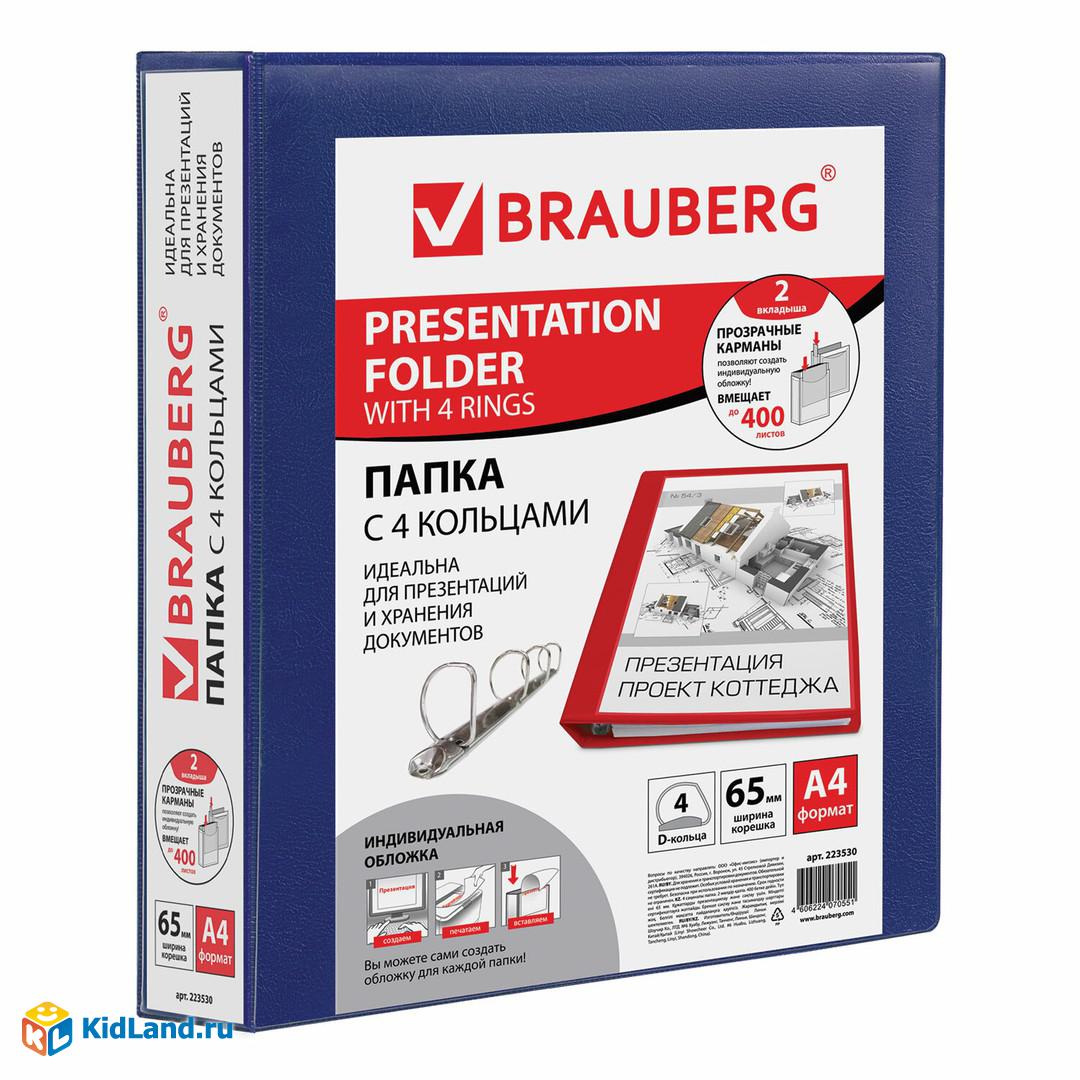 Папка на 4 кольцах с передним прозрачным карманом BRAUBERG, картонПВХ, 65 мм, синяя, до 400 листов,