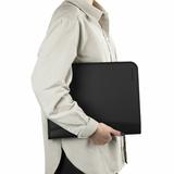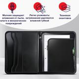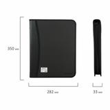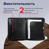 Изготовлена из прочного черного полипропилена толщиной 0,9 мм с фактурой t;бисерt;. Формат А4 (350х282 мм). Имеет два внутренних отделения и четыре кармана. Надежный замок-молния защищает документы от механических повреждений, а также пыли и влаги. Цвет молнии - черный.