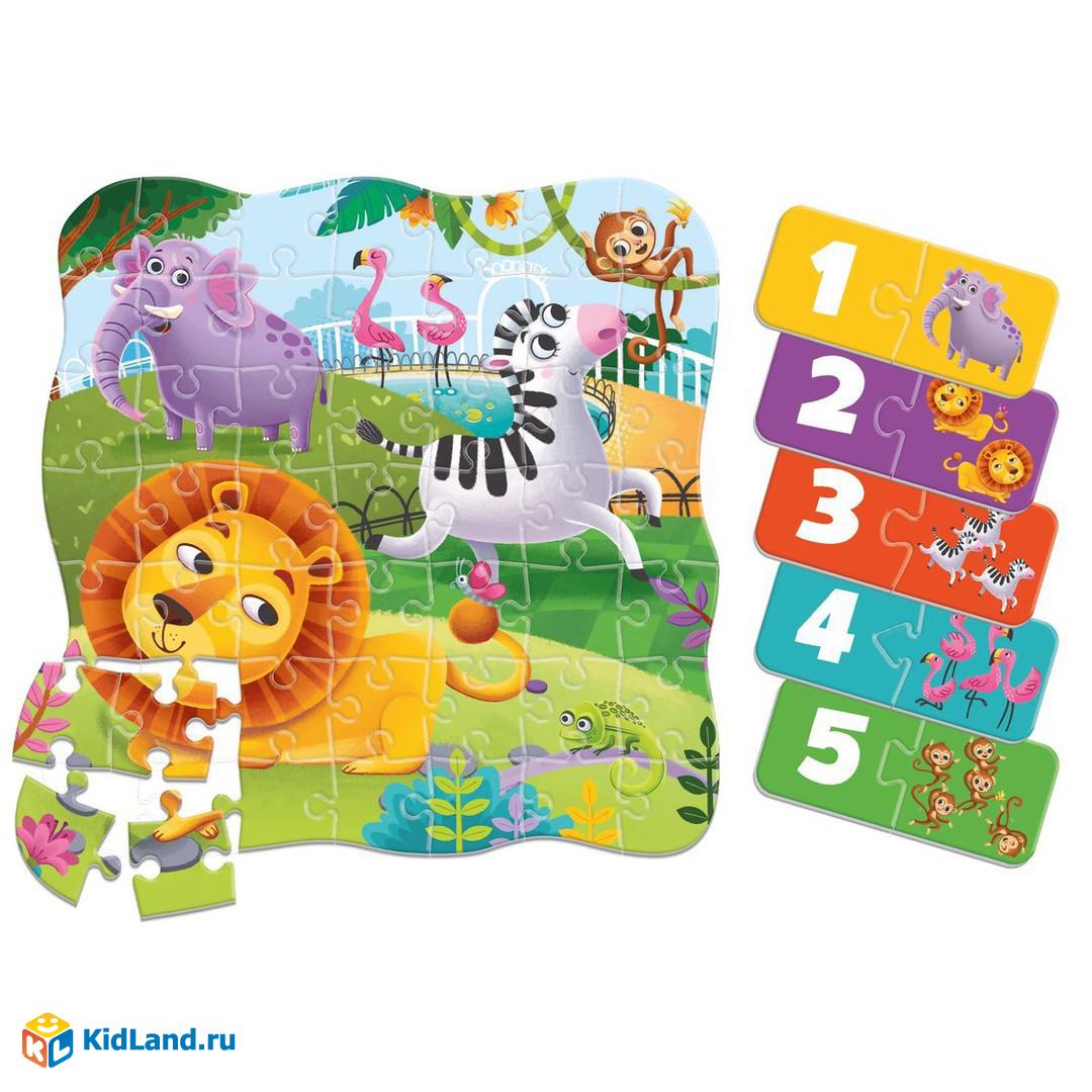 Слон, обезьяна, зебра... Кто еще живет в зоопарке? Собирайте пазл и знакомьтесь с экзотическими животными.