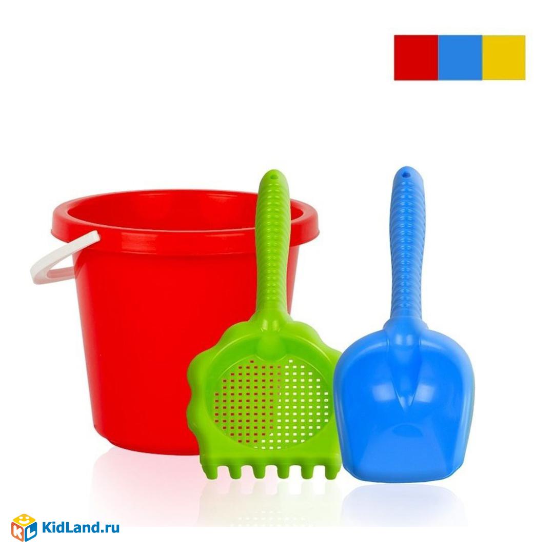 воображение, мелкую моторику рук и координацию движений, знакомиться с окружающим миром. Состав: ведро большое, совок L26 см, грабли-ситечко L25 см.