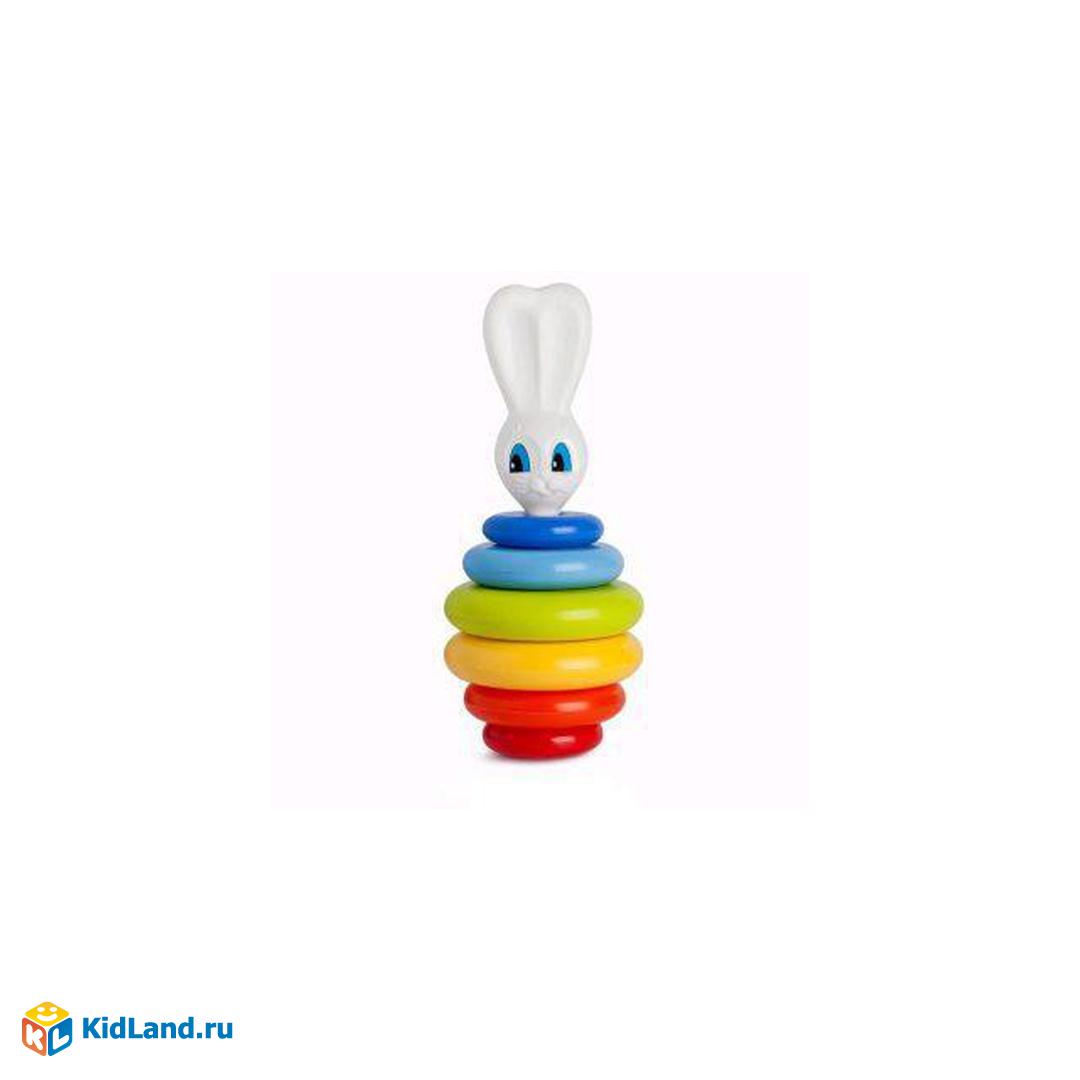 Серенький зайчонок разместился на самой вершине этой пирамидки. Игрушка собирается в форме бочонка, состоит из шести колец — по два колечка одного диаметра.
