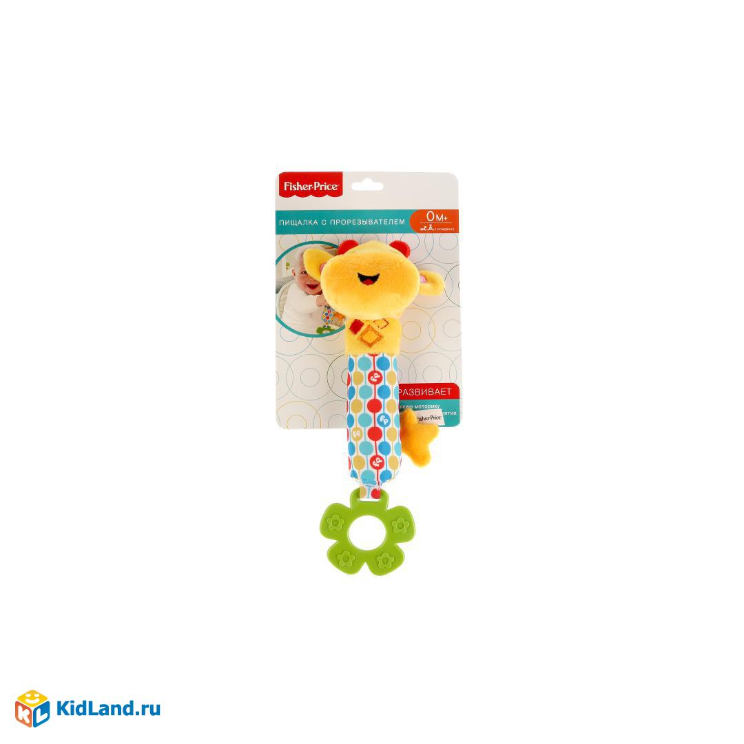 Пищалка "Жираф" - это новая игрушка Fisher Price, разработанная специально для малышей. Она сделана из мягкого материала в ярких цветах, в окрашивающий состав добавлены пищевые красители. Благодаря этому игрушка безопасна для ребёнка в самом раннем возрасте. Внутри находится элемент, который пищит при нажатии. Снизу дополнена элементом-прорезывателем в форме лепестка, с помощью которого можно чесать дёсны, когда появляются зубки. Развивает слух, внимательность, мелкую моторику и зрение. Рекомендуется детям от 0 месяцев.