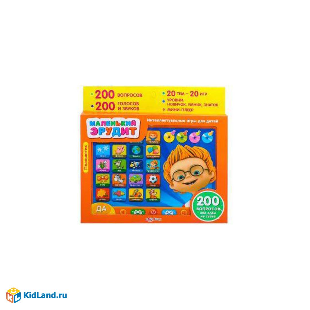Ваш малыш любит умные игры-викторины? Тогда этот планшетик – для него! 200 вопросов, 20 разнообразных тем, 3 уровня сложности ждут маленького эрудита. А любознательный Макс поможет игроку стать Суперзнатоком! Бонус – мини-плеер с современными танцевальными мелодиями: «Арам зам зам», «Полька Евы», «Танец утят», «Собачий вальс».