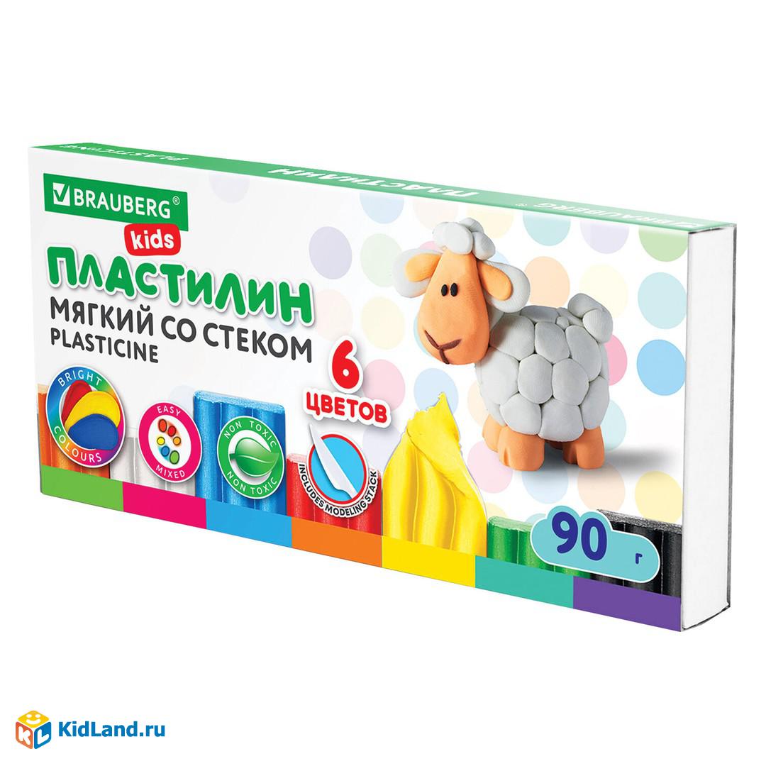 Пластилин мягкий восковой BRAUBERG "KIDS", 6 цветов, 90 г, со стеком, 106493