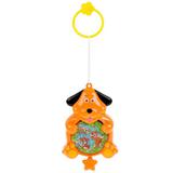 Потяните за звёздочку со шнуром: у игрушки включится звук (классическая мелодия) и придёт в движение картинка с изображением очаровательных щенят на лужайке, расположенная на животике собачки. Яркие цвета, весёлая мордочка, музыка и подвижные элементы увлекут малыша, способствуя развитию и даря массу положительных эмоций. В комплекте прилагается кольцо, с помощью которого можно прикрепить игрушку к кроватке, коляске или в другом месте.