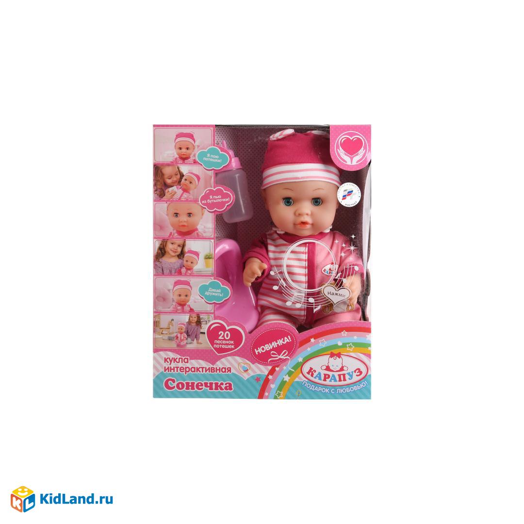 Интерактивная кукла «Сонечка» ТМ «Карапуз» представляет собой озвученную игрушку, которая поёт 20 песенок и потешек: «Андрей-воробей», «Водичка, водичка», «Ай, дуду-дуду-дуду», «Ехали, ехали», «Божья коровка», «Гуси», «Как у наших у ворот», «Баю-баюшки», «Дай молочка», «Каравай», «Котик», «Кошкин дом», «Ладушки», «Лисичка», «Мишка косолапый», «Петушок», «Сидит белка на тележке» и другие.