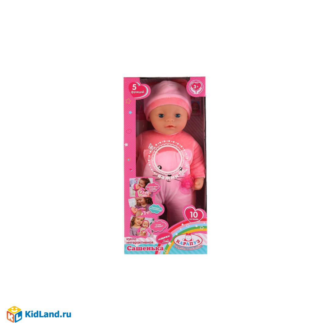 Интерактивный пупс «Сашенька», новинка ТМ «Карапуз» станет лучшим подарком для девочек! Куколка представляет собой озвученную игрушку, которая поёт 10 потешек: «Андрей-воробей», «Водичка, водичка», «Ай, ду-ду», «Коза рогатая», «Ехали, ехали», «Божья коровка», «Гуси», «Как у наших у ворот», «Баю-баюшки», «Дай молочка».