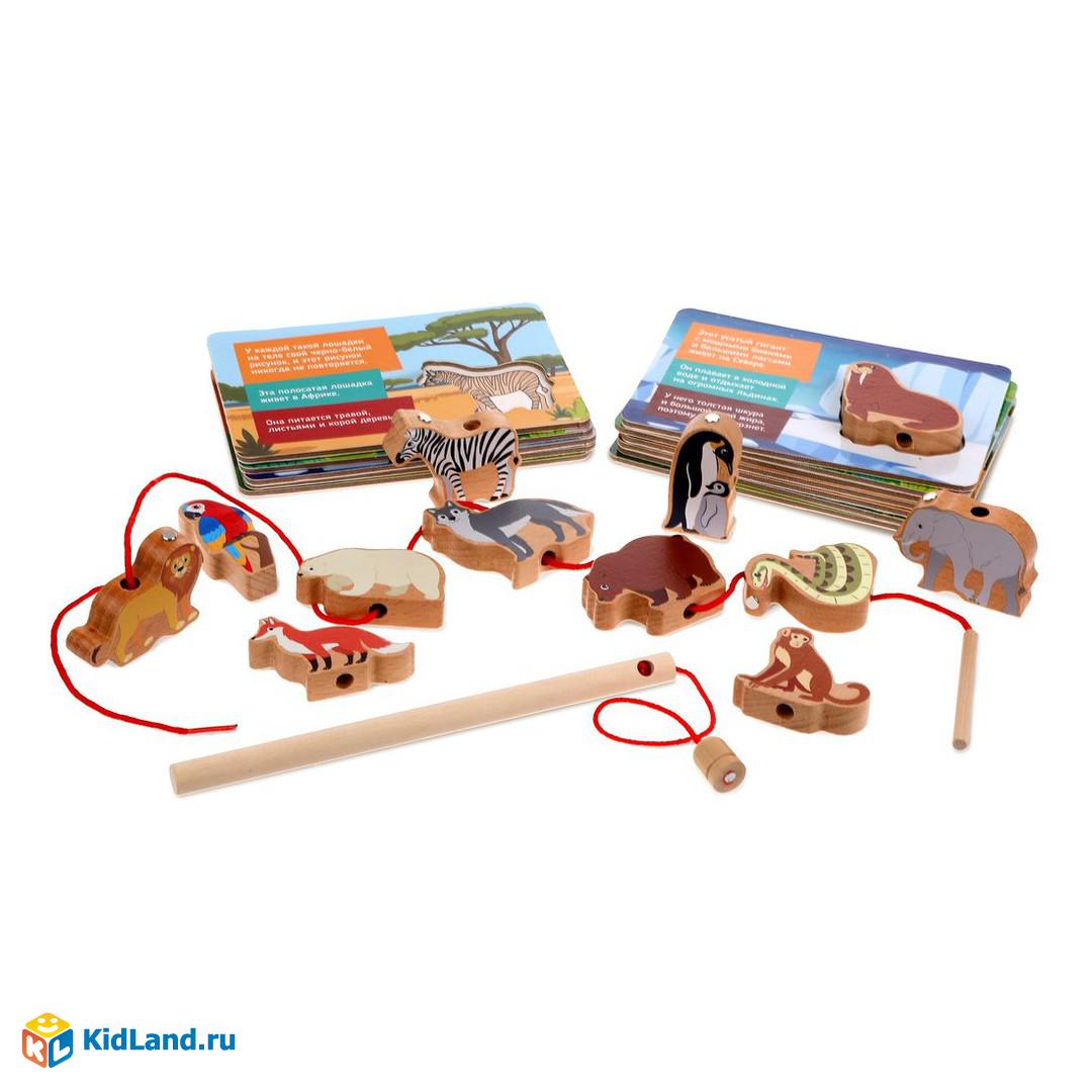 Развивающая игра 4в1 "Мир животных": шнуровка, вкладыш, рыбалка, обучающие карточки
