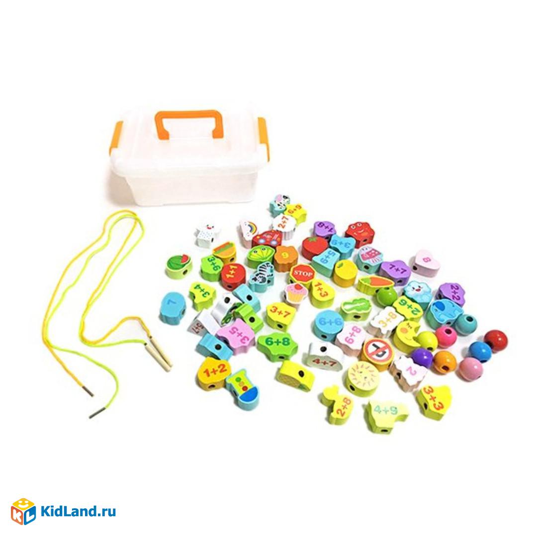 В комплекте – 65 разноцветных деревянных бусин с примерами, цифрами и яркими картинками, а также 2 текстильных шнурка длиной 70 см.