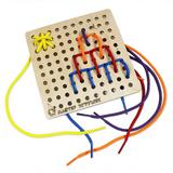 Деревянная панель с прорезями для продевания разноцветных шнурков.