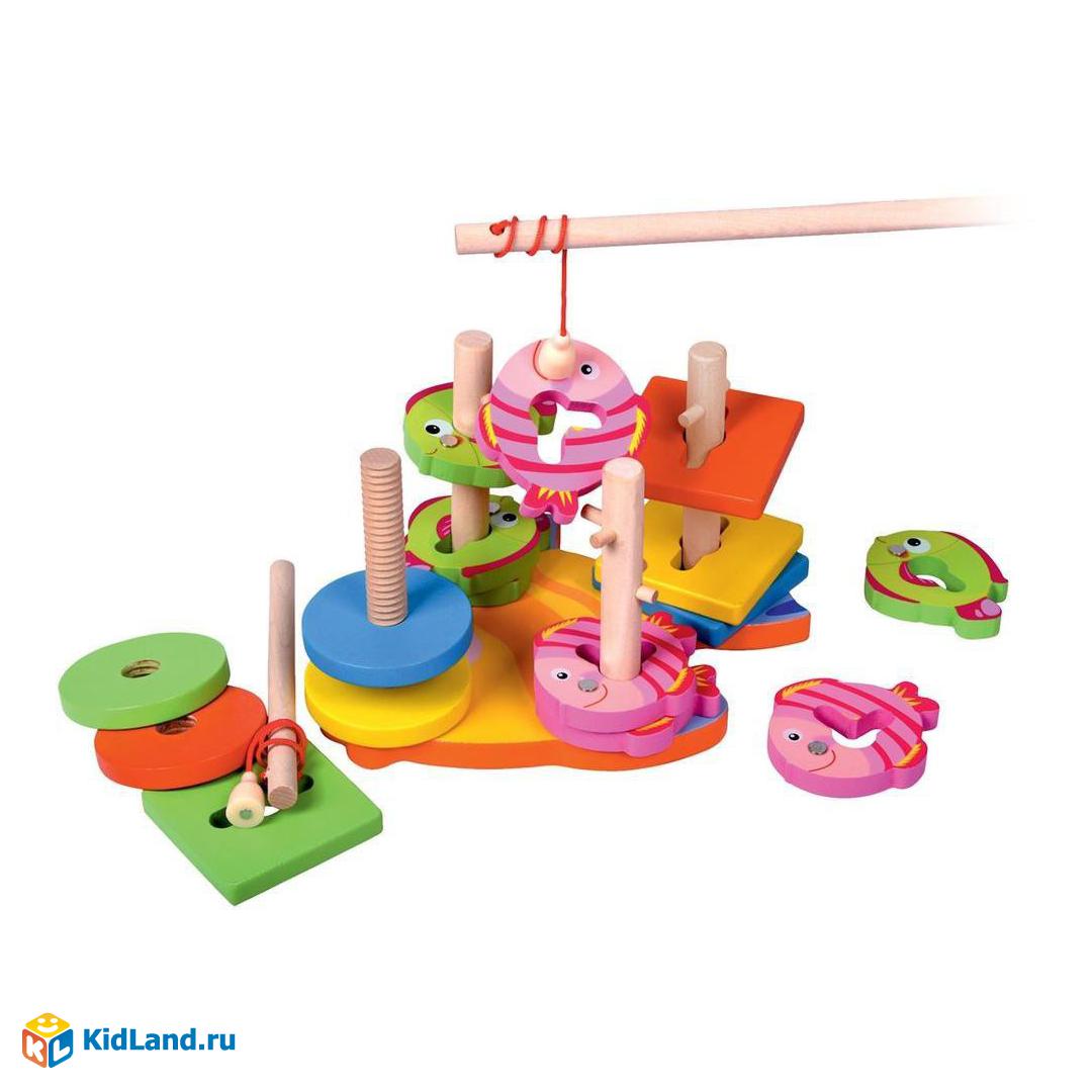 2 вариант игры: 8 деталей в виде рыбок оснащены небольшими магнитиками. Ребёнку нужно поймать этих красочных подводных обитателей, используя специальную магнитную удочку. Наличие в наборе второй удочки позволяет играть вдвоём.