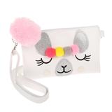 Аксессуар выполнен в классическом белом цвете. На лицевой стороне изображена забавная мордочка ламы с серебристыми и яркими, разноцветными декоративными деталями-помпонами. Сумка застёгивается на молнию и снабжена ремешком для комфортного ношения. К бегунку молнии прикреплён крупный пушистый помпон нежно-розового цвета.