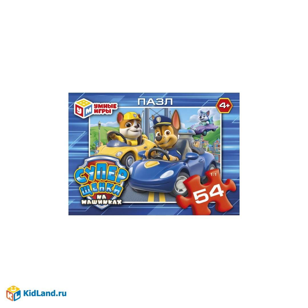 Суперщенки в машинках. Пазлы в коробке 54 детали. 90х65х25 мм. Умные игры в уп.32шт