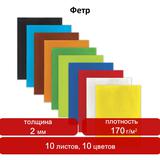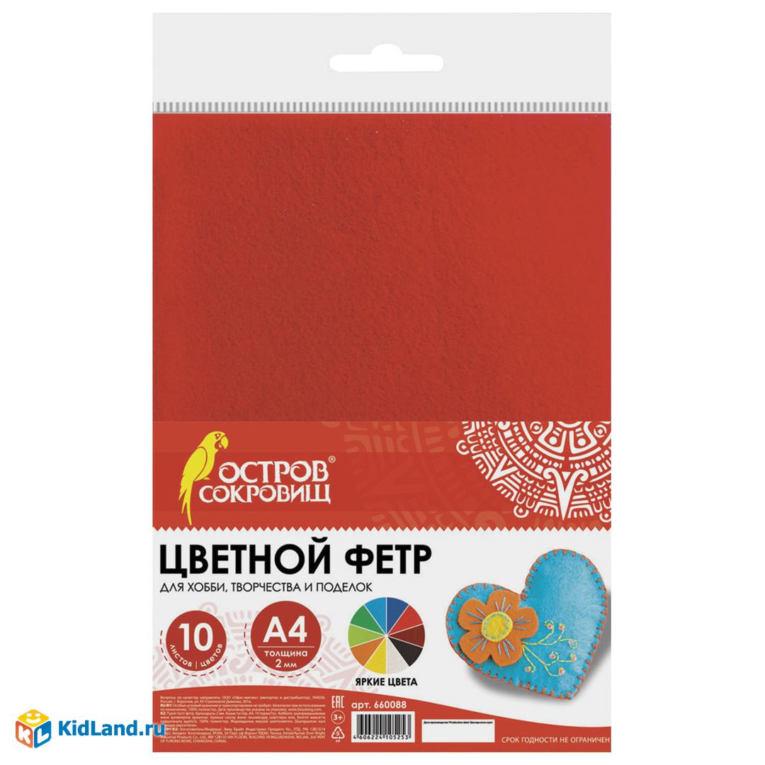 Цветной фетр для творчества, А4, ОСТРОВ СОКРОВИЩ, 10 листов, 10 цветов, толщина 2 мм, 660088